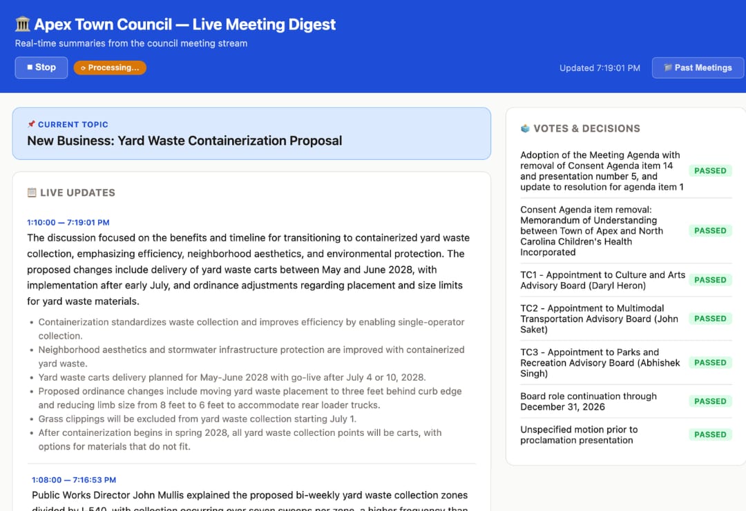 If you have ever watched or attended a Town Council meeting, you know those things can go 2… 3… sometimes 4+ hours. It’s a lot to dig through sometimes in order to provide updates. So I created a tool that watches the meeting for me and then gives me updates in real-time.